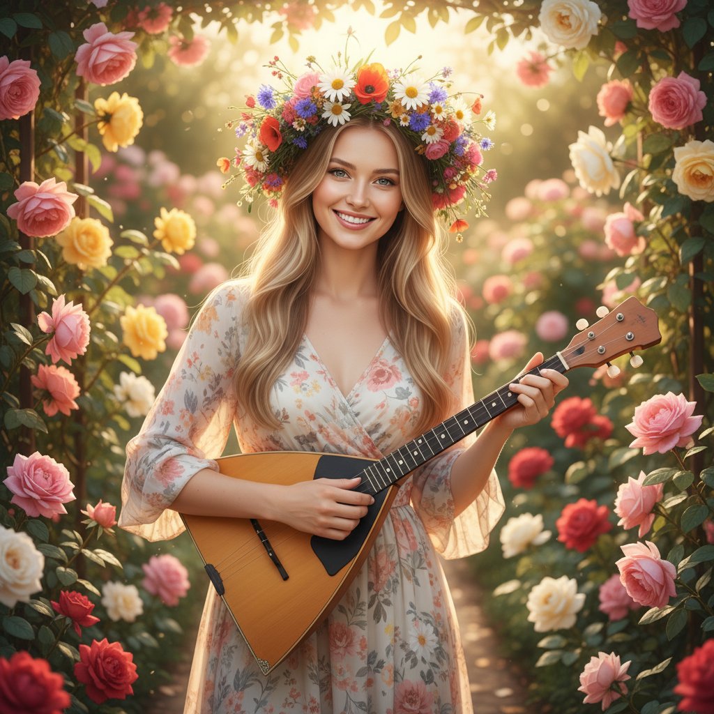 Молодая женщина в легком летнем платье и венке из полевых цветов на голове, с балалайкой в руках, улыбается зрителю. Она стоит посреди цветущего сада, усыпанного розами. Солнечный свет освещает ее лицо и наряд, создавая теплую атмосферу.