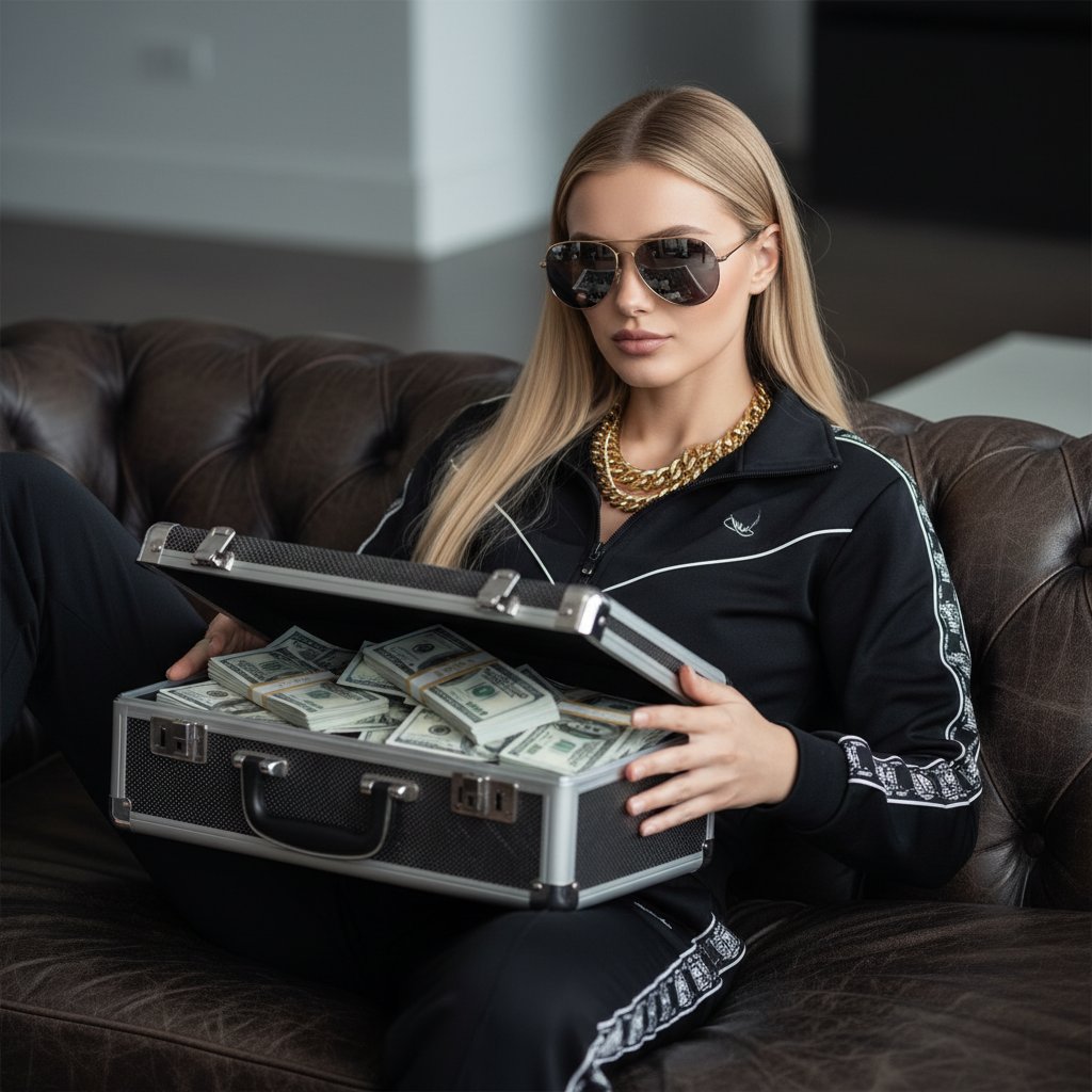 Стильная девушка в дизайнерском спортивном костюме, солнцезащитных очках и золотой цепи расслабленно сидит на роскошном кожаном диване. В руках она держит открытый чемодан, набитый купюрами. Девушка смотрит прямо в объектив, на ее лице легкая самоуверенная ухмылка. Снято крупным планом.