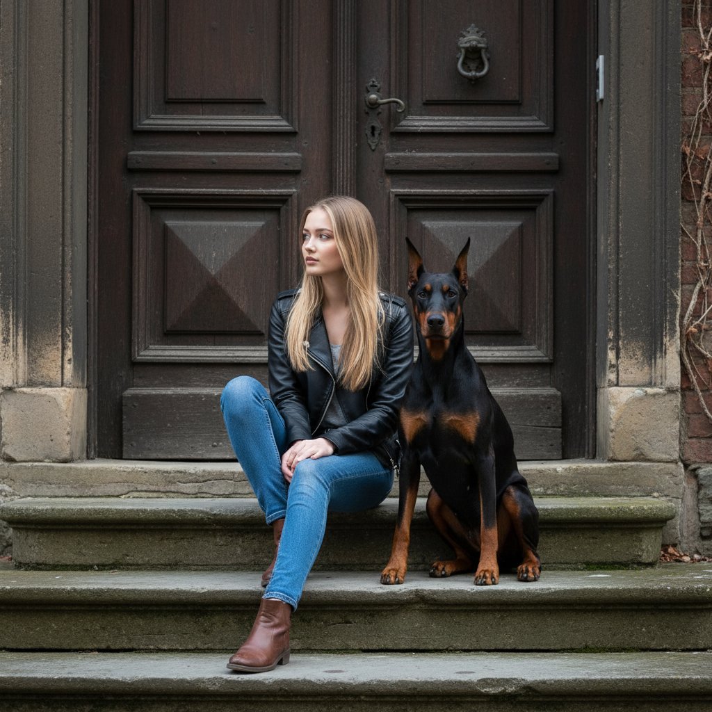 Молодая женщина в черной кожаной куртке и синих джинсах расположилась на ступенях у старинной двери. Рядом с ней сидит доберман, смотрящий прямо в объектив. Женщина отводит взгляд в сторону, ее руки покоятся на коленях. Естественное освещение подчеркивает их взаимную связь.