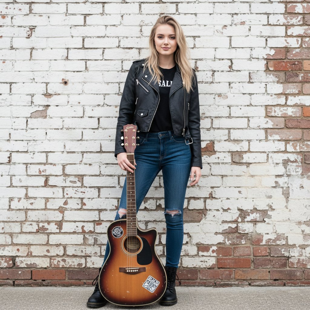 Молодая женщина в рваных джинсах и короткой кожаной куртке позирует у стены, держа акустическую гитару за гриф и глядя в объектив.