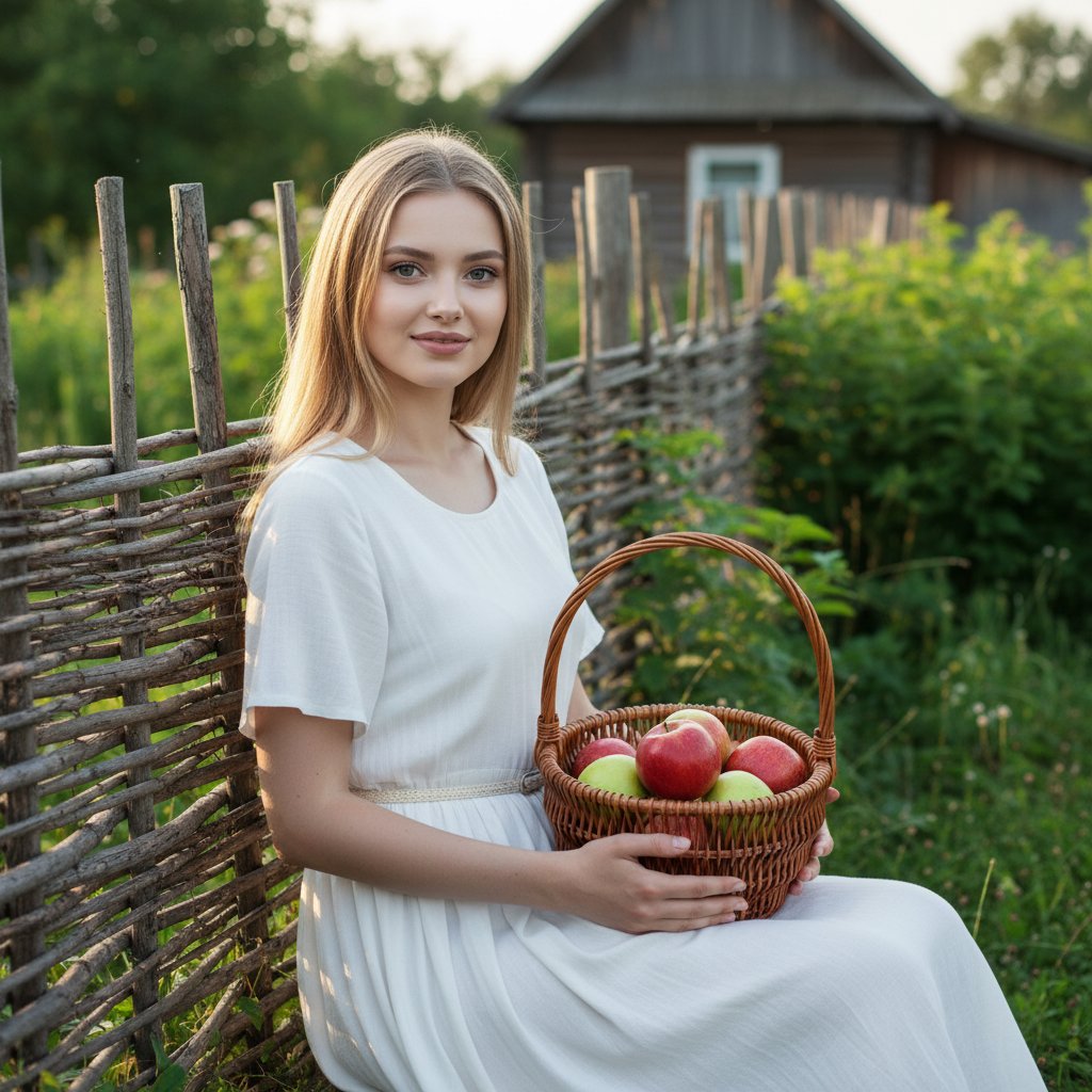 Молодая женщина в летнем платье белого цвета, подпоясанном тонким ремешком, расположилась у плетня. В руках у неё корзина, полная спелых яблок. Она смотрит в объектив, на её лице лёгкая, добрая улыбка. На заднем плане раскинулись пышные зелёные кусты и скромный деревянный домик. Мягкий свет подчёркивает её естественность и сельскую идиллию.
