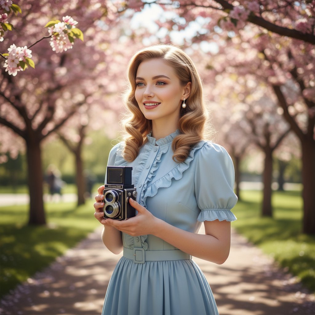 Молодая леди в аутентичном платье 40-х годов, украшенном рюшами и поясом, прогуливается по парку в окружении цветущих деревьев. Её прическа — элегантные локоны, а уши украшены жемчужными сережками. С легкой улыбкой она держит винтажную фотокамеру, излучая беззаботность. Яркий солнечный свет пробивается сквозь листву, освещая сцену и отбрасывая мягкие тени.