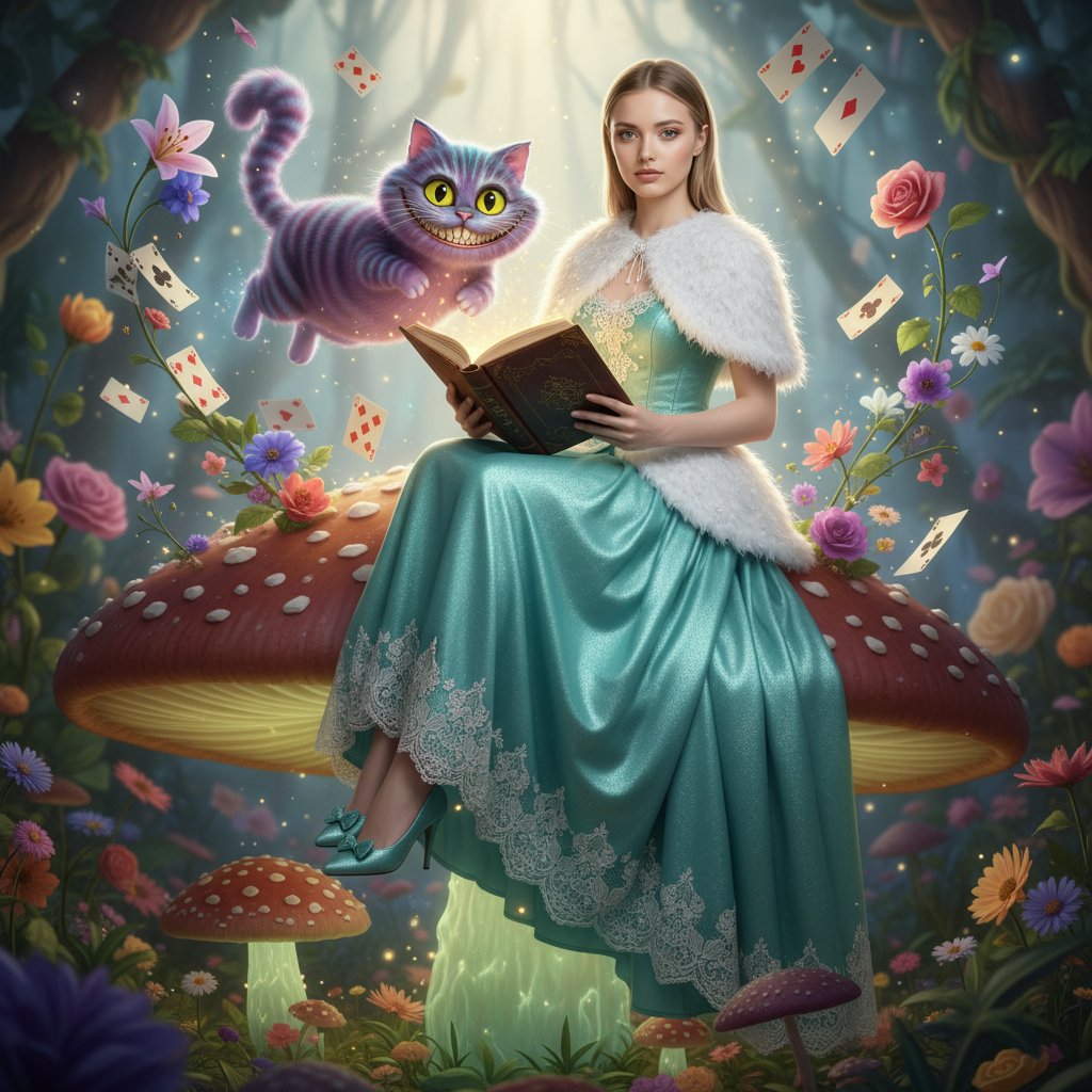 Девушка в длинном аквамариновом платье с кружевами и белым пелериной, сидит на гигантском грибе. Рядом парит улыбающийся Чеширский кот. В руках у нее книга, вокруг летают карты и цветы. Она смотрит в камеру, средний план, волшебная атмосфера.