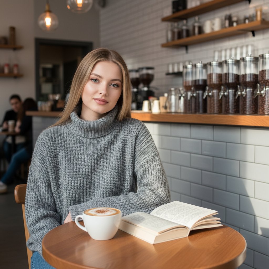 Молодая женщина в мягком сером свитере расположилась за столиком в кафе, рядом с барной стойкой, за которой видны стеклянные емкости с кофе и светлая плитка. Перед ней стоит чашка раф-кофе и раскрытая книга. Она смотрит прямо в объектив, освещенная мягким дневным светом.