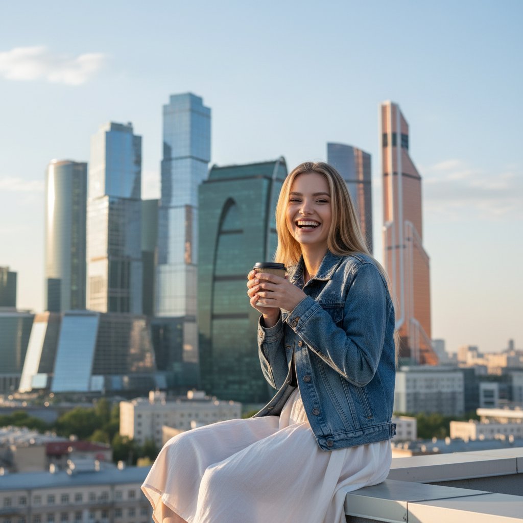 Портрет девушки в джинсовой куртке и светлой юбке, сидящей на краю крыши в центре Москвы. Она свесила ноги и держит в руках чашку кофе, смеясь в камеру. На заднем плане видны небоскребы Москва-Сити. Снято крупным планом, передает ощущение легкого утра.