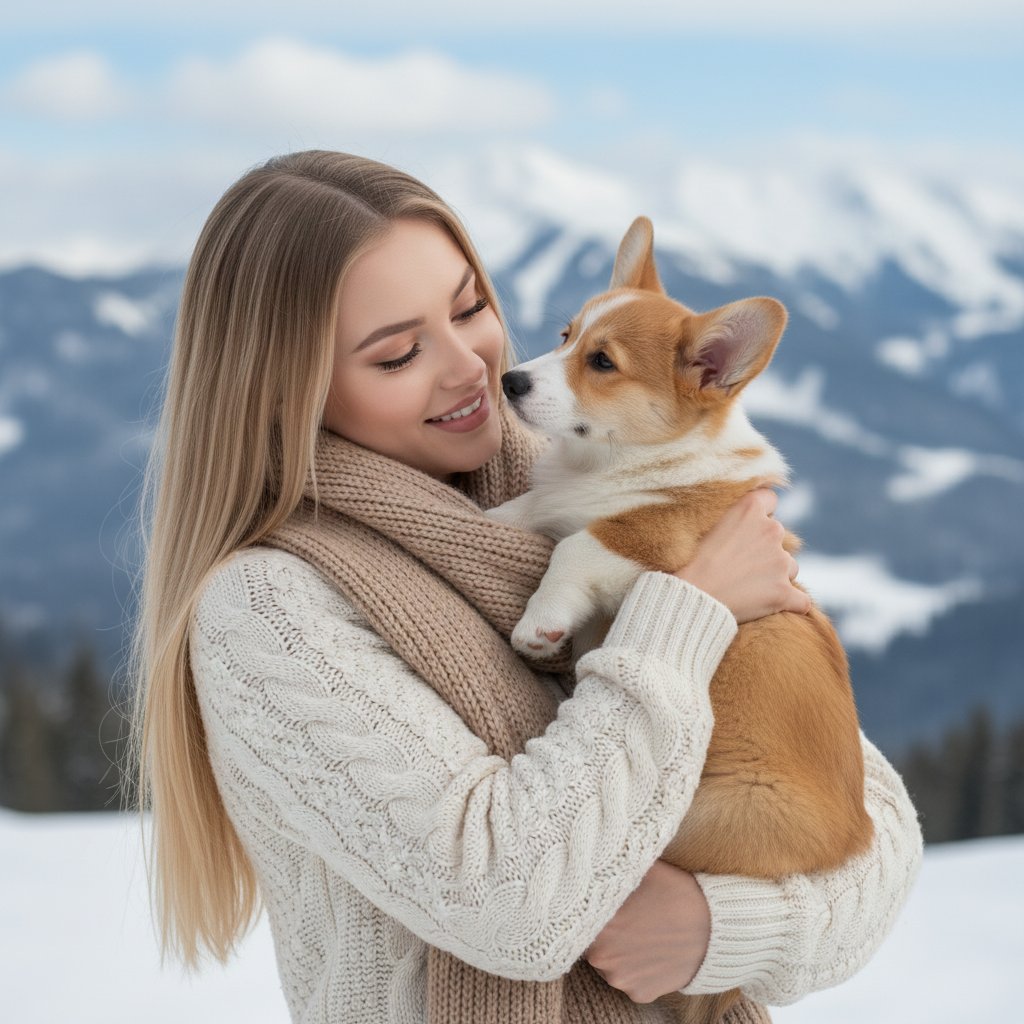 Портрет молодой женщины в теплом свитере и шарфе, нежно обнимающей милого щенка корги. На заднем плане раскинулись заснеженные горы. Женщина смотрит на щенка с улыбкой.