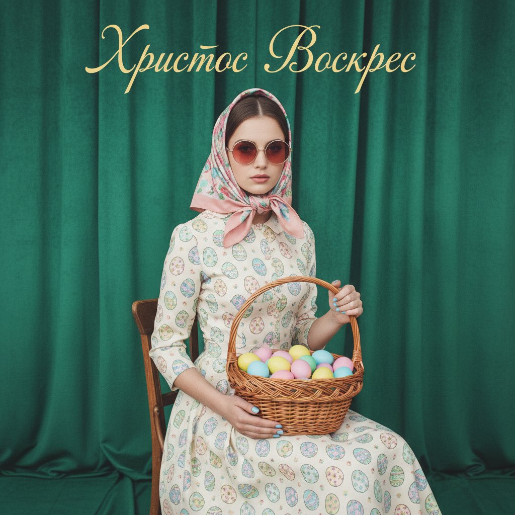 Создай яркий винтажный пасхальный портрет. Девушка сидит на стуле на фоне мягкого зеленого фона. На ней платье с принтом из пасхальных яиц, платок на голове и большие розовые очки. Она держит корзину с разноцветными пасхальными яйцами. Стиль немного ретро, модный и праздничный. Цветовая гамма пастельная и весенняя. Стиль — fashion portrait, pastel vintage aesthetic, studio lighting, photorealistic, highly detailed, 4k. Добавь красивую праздничную надпись: «Христос Воскрес».