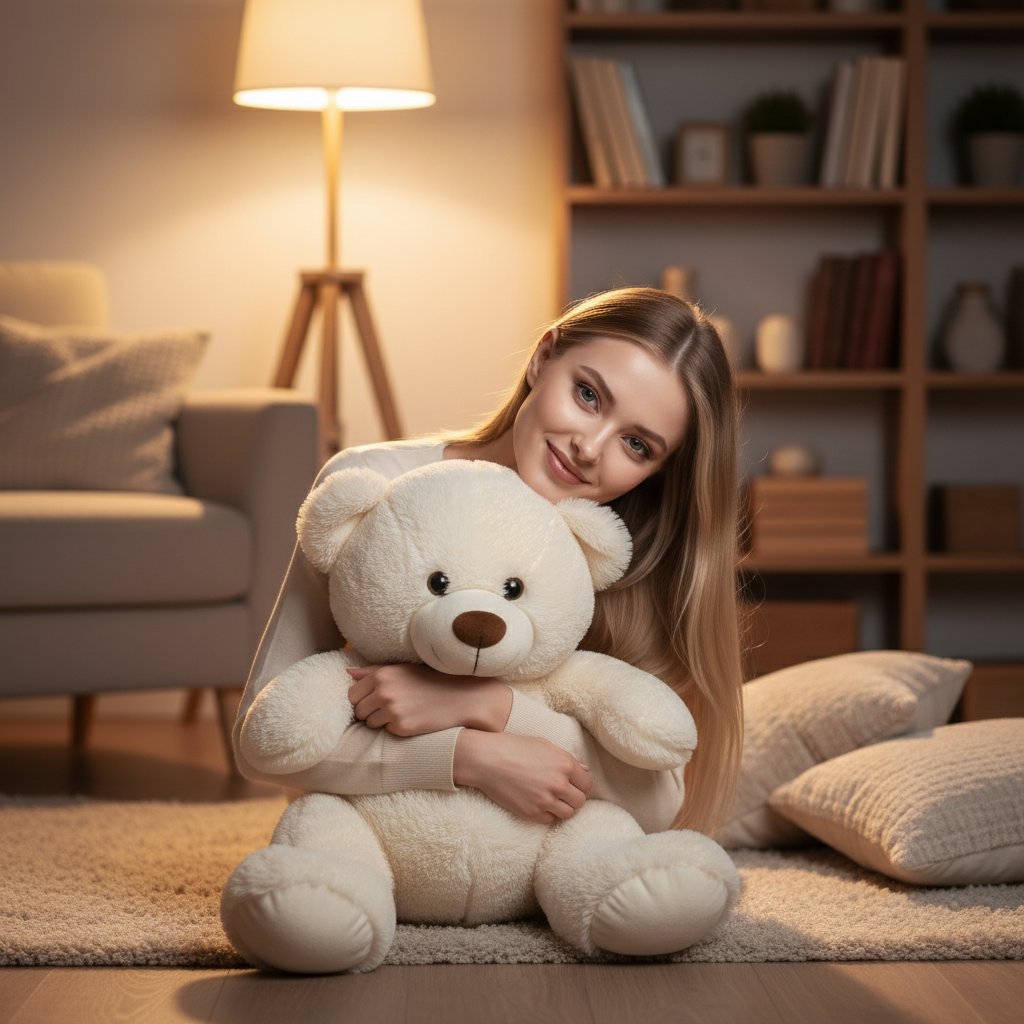 Женщина расположилась на полу в тёплой комнате, нежно обнимая большого плюшевого медведя кремового оттенка. Её взгляд направлен в объектив, а на лице играет добрая улыбка, голова слегка опущена. За её спиной — тёплое сияние торшера, книжные полки и мягкие подушки, всё вместе создаёт атмосферу домашнего уюта.