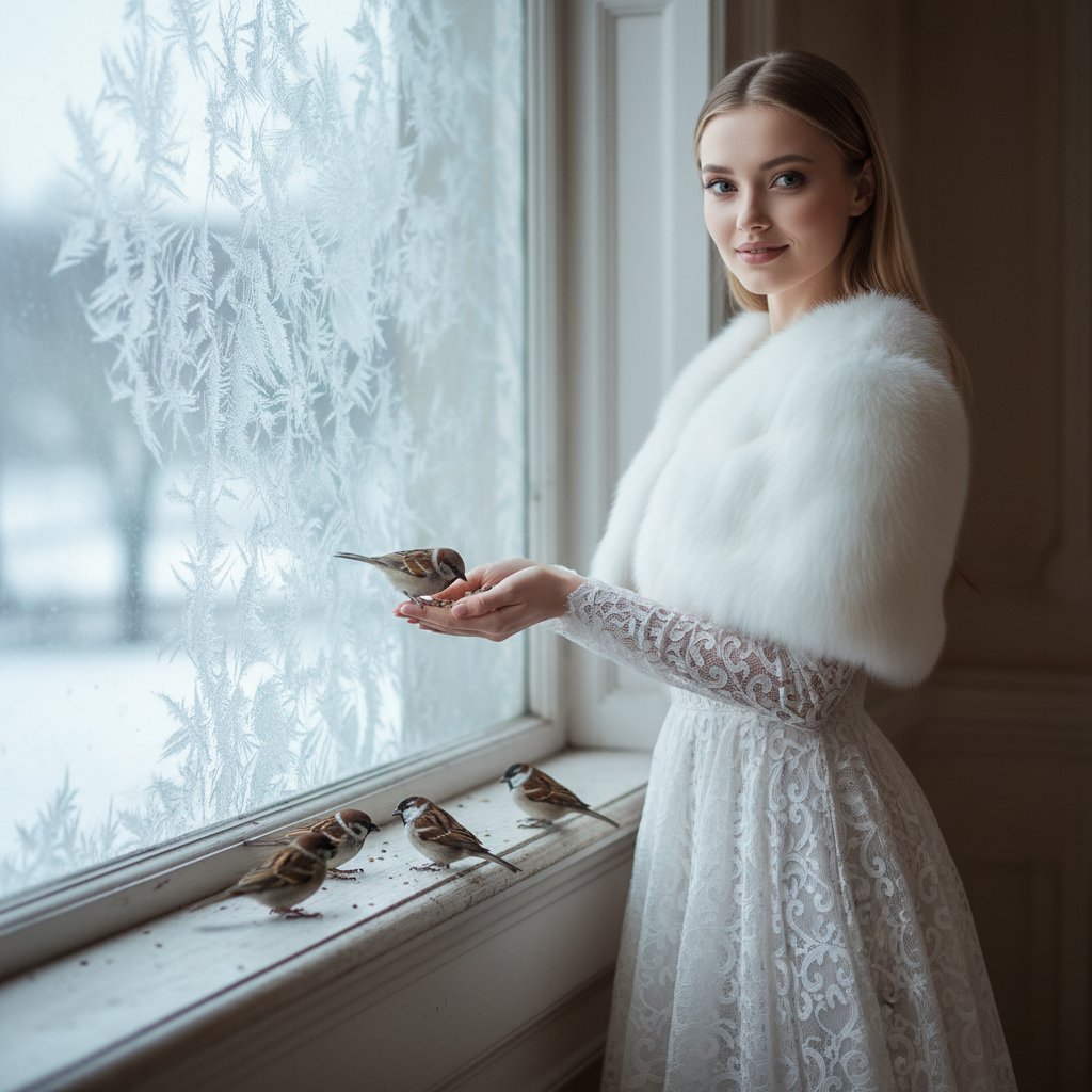 Прекрасная дама в изящном белом кружевном платье и меховой накидке угощает птиц, сидящих на подоконнике с морозными узорами. Взгляд направлен в объектив.