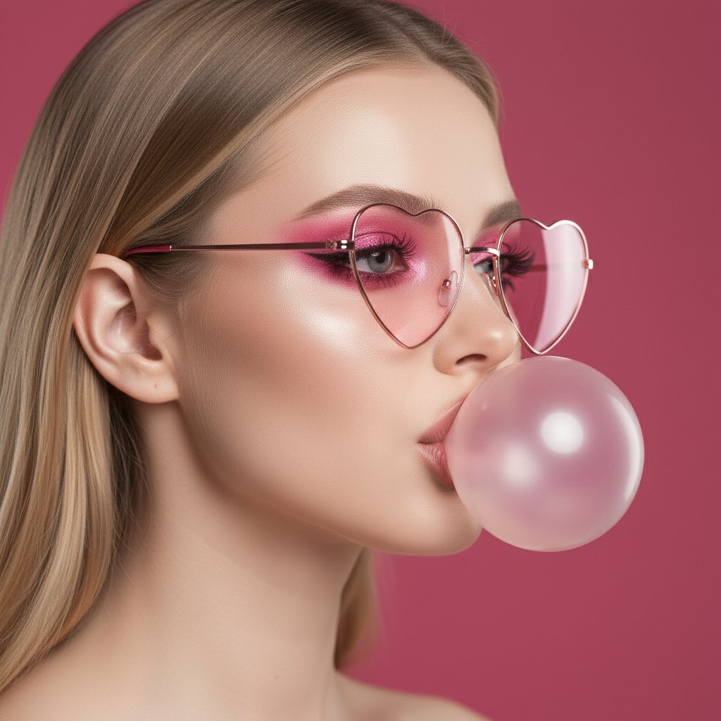 Боковой кадр: девушка надувает огромный пузырь из розовой жвачки. На ее носу — очки в форме сердца с розовыми линзами, отражающими свет. Ультрареалистичный портрет крупным планом, разрешение 8K. Акцент на выразительных розовых тенях для век, драматичной черной подводке, пышных ресницах и мягких розовых губах. Фон — насыщенный розовый, гармонирующий с образом. Кожа излучает перламутровый блеск, создавая эффект нежного гламура. Модно, эффектно, настоящий шедевр.