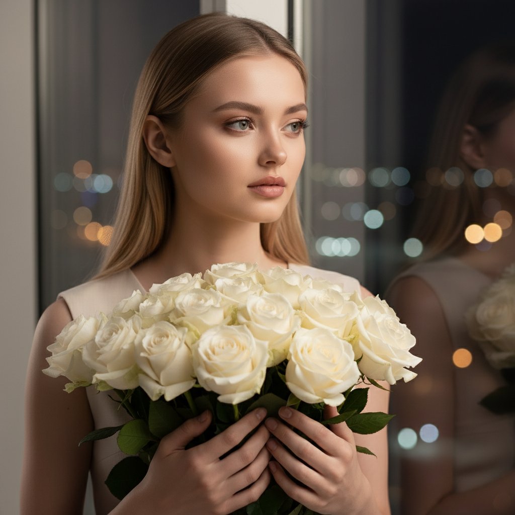 Портрет девушки, стоящей у окна с пышным букетом белоснежных роз. Её руки бережно держат цветы, а взгляд устремлен вдаль, наполненный мечтательностью. За окном виднеются мягкие, размытые огни ночного города. Крупный план, передающий атмосферу изящества и хрупкости.