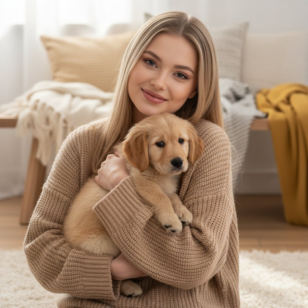 Молодая девушка в мягком свитере уютно устроилась на полу, нежно прижимая к себе очаровательного щенка золотистого ретривера. Мягкий, рассеянный свет создает теплую, домашнюю атмосферу, дополненную пледами на фоне. Взгляд девушки направлен в камеру, передавая чувство искренней радости.