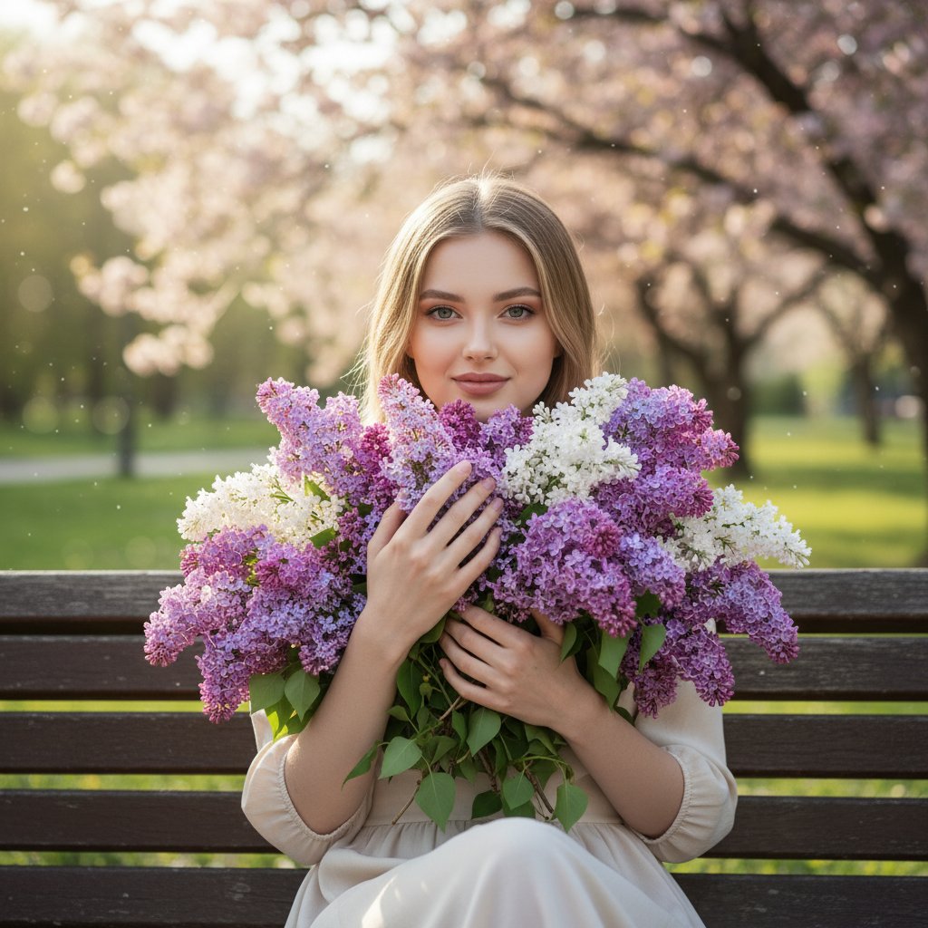 Женский портрет: молодая женщина сидит на парковой скамейке, скрываясь за раскидистым букетом сирени, который она ласково прижимает к себе. Легкая улыбка на лице, пальцы нежно касаются цветов. На заднем плане — цветущие весенние деревья, освещенные мягким, теплым светом.