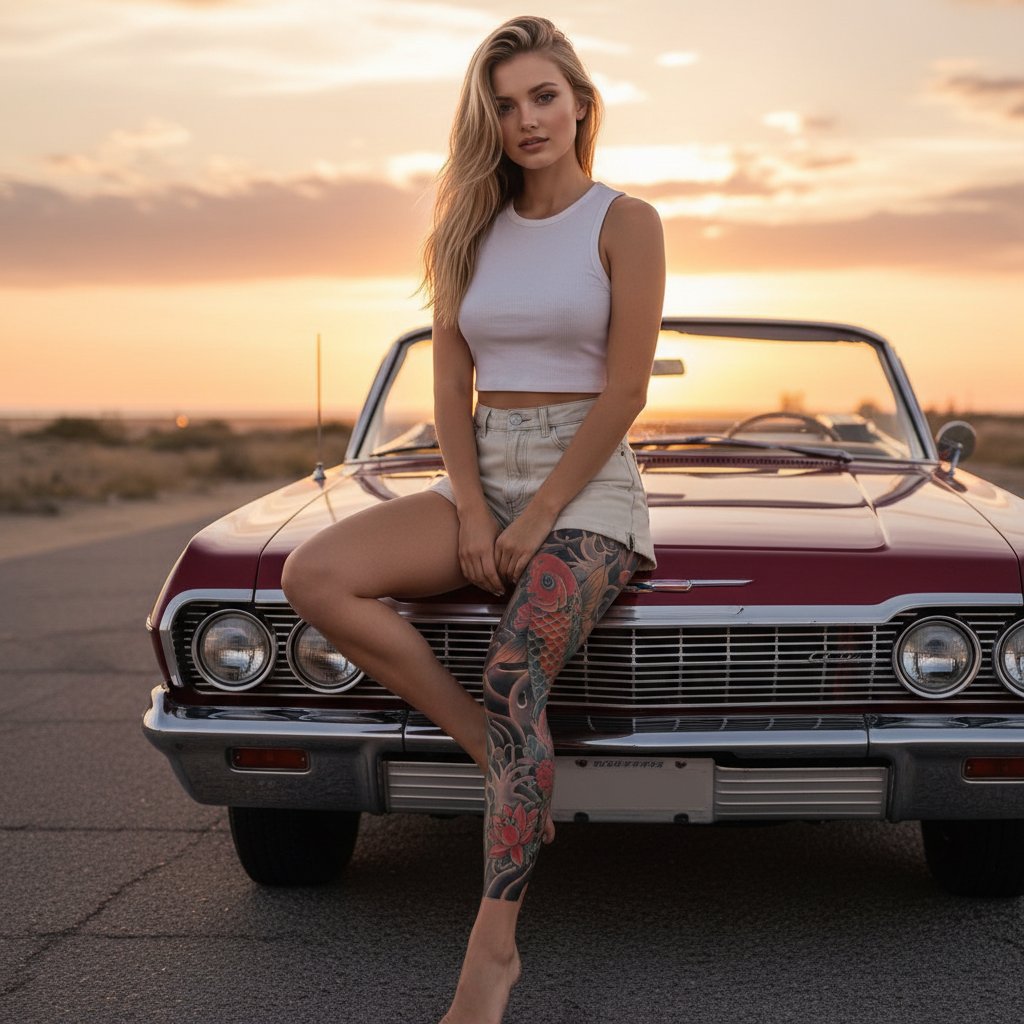 Молодая женщина в белом укороченном топе и свободных шортах расположилась на капоте старинного автомобиля. Ноги скрещены, открывая вид на татуировку в виде японского карпа, занимающую всю голень. На заднем плане — закатное небо, заливающее сцену тёплым золотистым светом.