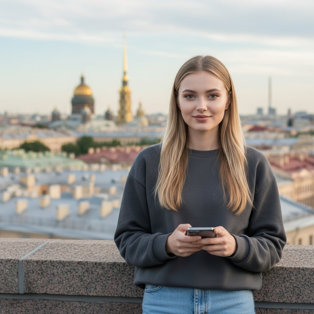 Молодая женщина в повседневной одежде (свитшот, джинсы) стоит у парапета на крыше в Санкт-Петербурге, держа в руках смартфон. На заднем плане видны знаменитые шпили и городские пейзажи Петроградской стороны. Взгляд направлен в объектив, легкая, уверенная улыбка. Съемка крупным планом, атмосфера современного мегаполиса.
