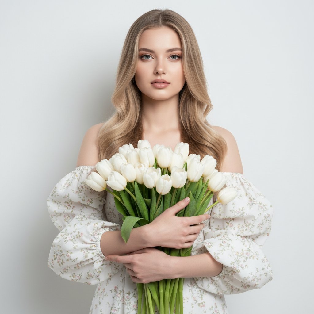 Молодая женщина в белом платье с открытыми плечами и объемными рукавами, украшенном мелким цветочным узором, стоит на фоне безупречно белой студийной стены. Она прижимает к себе пышный букет белоснежных тюльпанов. Ее волосы уложены элегантной волной, а легкий макияж подчеркивает взгляд, направленный прямо в объектив.