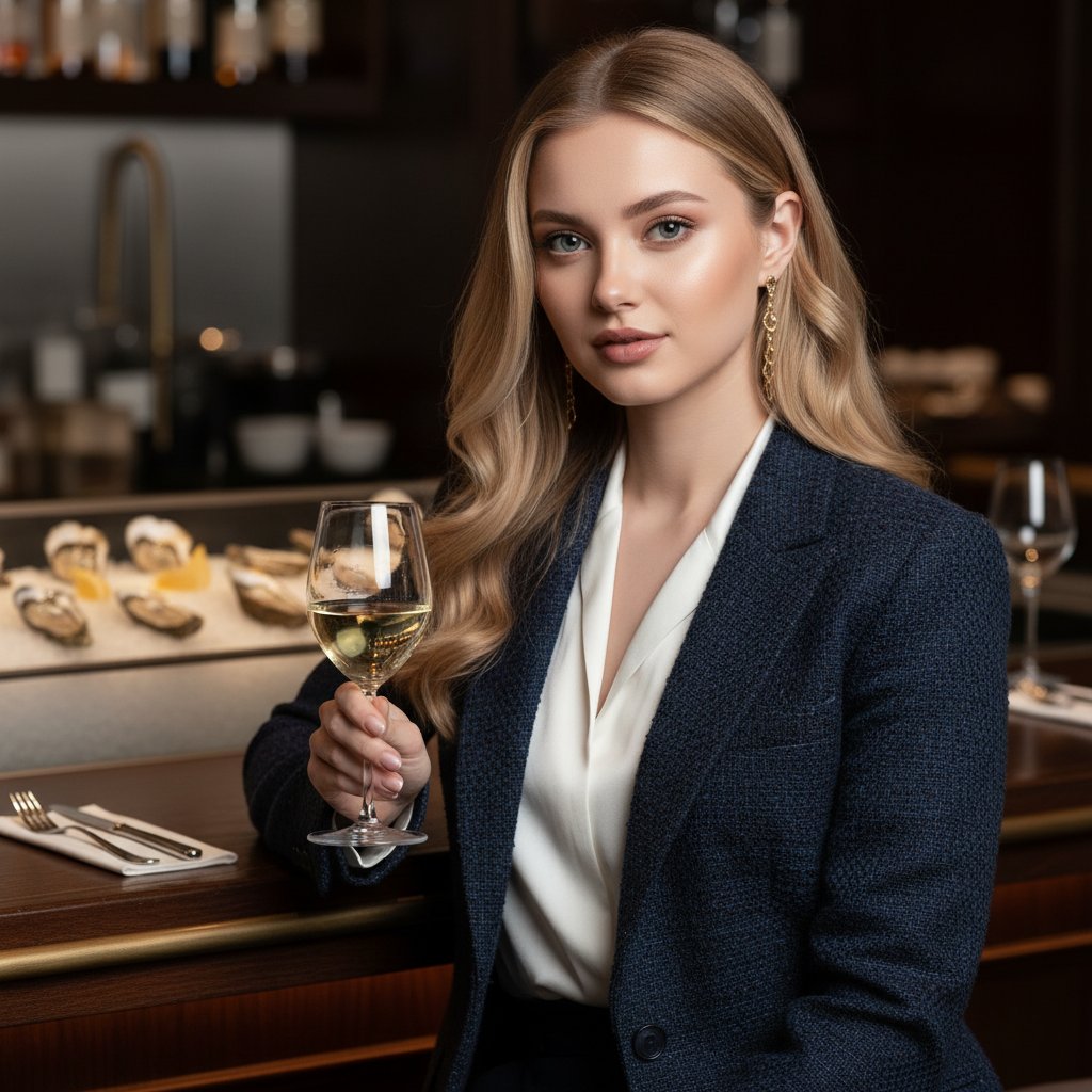 Молодая женщина со светлыми волнистыми волосами, уложенными элегантно, позирует у стойки в элитном рыбном ресторане. На ней темно-синий твидовый пиджак, белая шелковая блузка и золотые серьги-подвески. В руке у нее бокал белого вина. Она смотрит прямо в объектив. Задний план размыт, освещение мягкое, видны устрицы на льду. Снято со среднего расстояния.