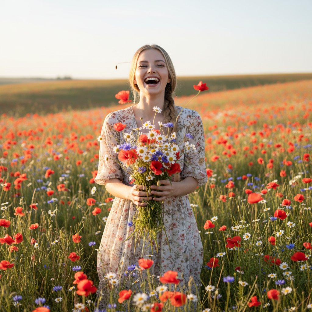 На залитой солнцем поляне, пестрящей маками, ромашками и васильками, стоит девушка с распущенной светлой косой. На ней легкое платье с цветочным принтом, в руках букет полевых цветов. Девушка смеется, подбрасывая цветы вверх, ее улыбка полна радости и беззаботности. Солнечный свет создает волшебную атмосферу, а разлетающиеся лепестки окутывают ее.