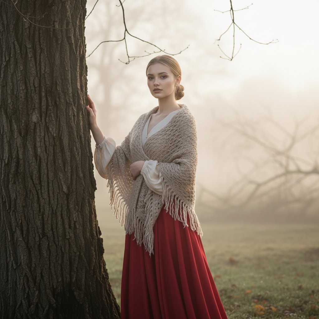 Молодая особа в алом платье-юбке и светлой блузе из натуральной ткани, с объемными рукавами, укрыта вязаным платком с бахромой, волосы уложены в низкий узел, стоит рядом с деревом, прикасается к стволу, взгляд направлен в объектив, чистый минимализм, раннее утро.