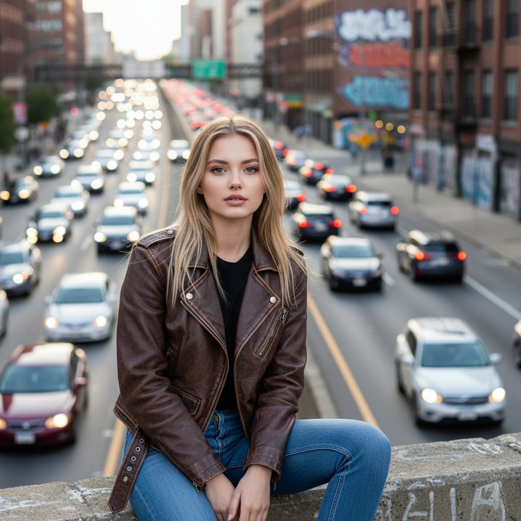 Молодая женщина в джинсах и кожаной куртке расположилась на невысоком бетонном парапете возле городской магистрали. Она смотрит прямо в объектив. На заднем плане — оживленное движение автомобилей и фасады зданий, украшенные граффити, создающие атмосферу энергичного города.