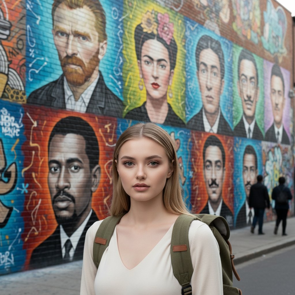 Портрет девушки с рюкзаком, стоящей перед ярко расписанной граффити-стеной с изображениями известных художников. Она смотрит прямо в объектив, в то время как на заднем плане видны размытые силуэты прохожих.