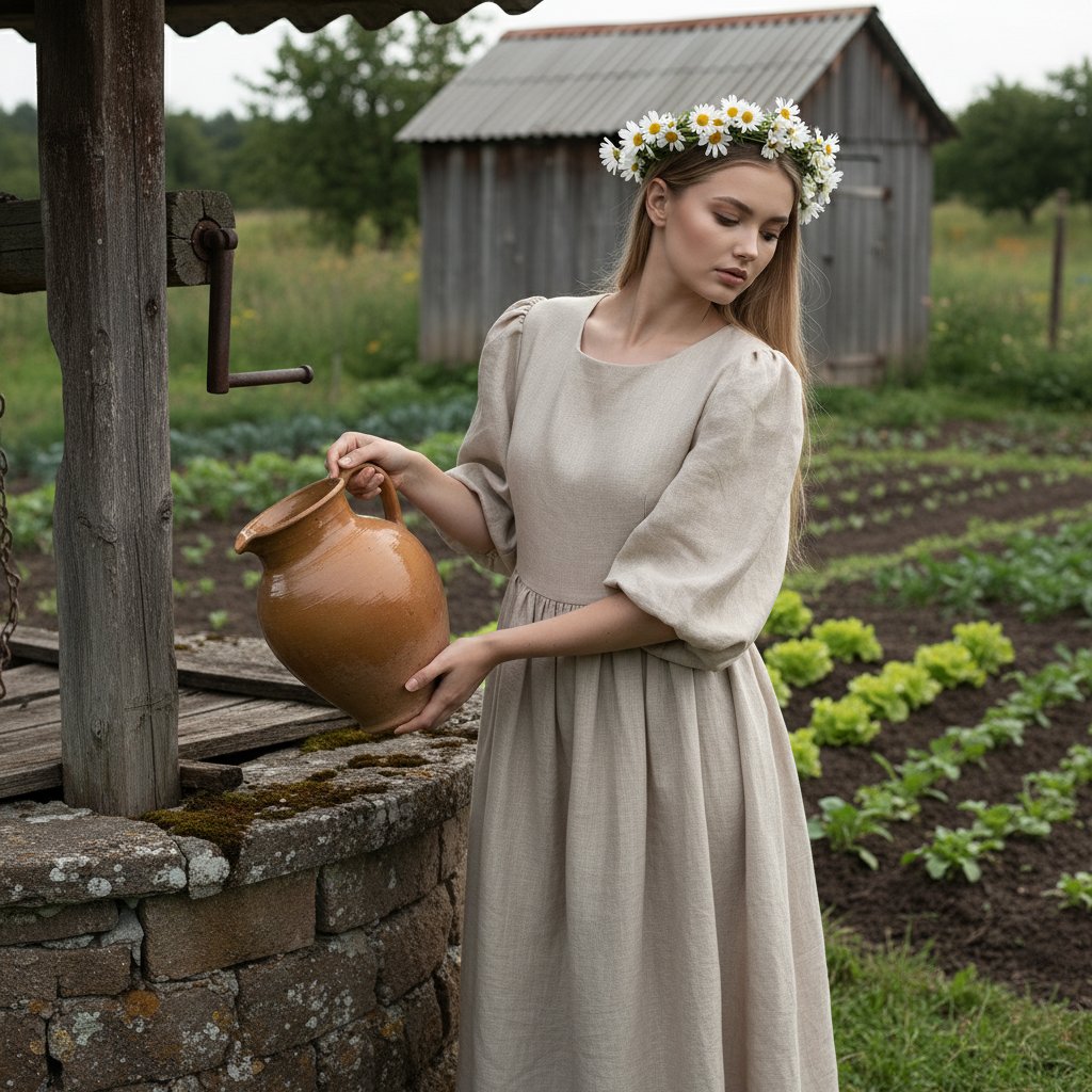 Женский портрет: девушка в бежевом платье с объемными рукавами стоит у старого деревянного колодца, держа в руках глиняный кувшин. Она смотрит вниз, а голову украшает венок из полевых ромашек. На заднем плане видны грядки с овощами и скромный сарай. Естественный дневной свет подчеркивает ее образ в стиле деревенской девушки.