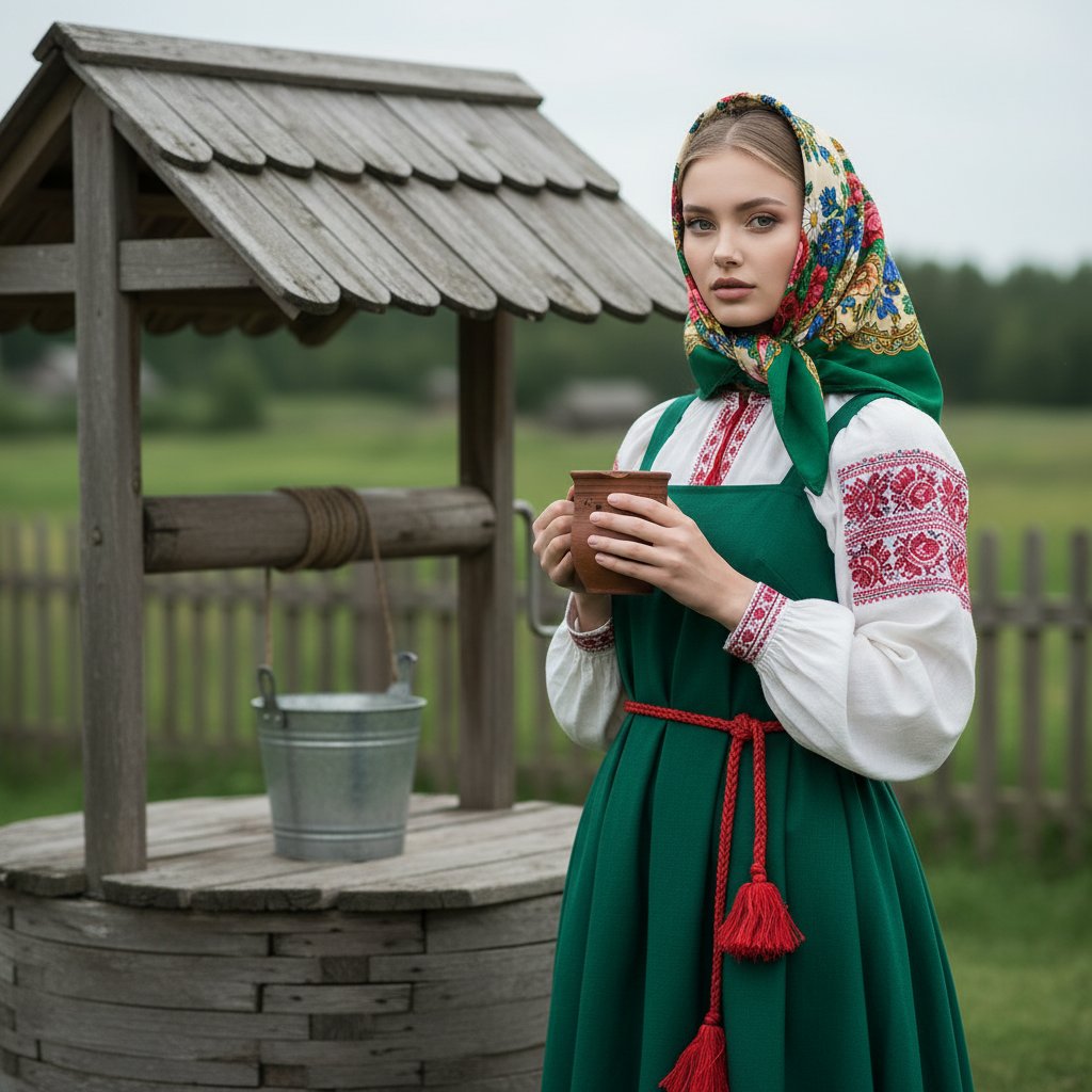 Портрет молодой девушки в традиционном русском наряде: белая рубаха, длинный зеленый сарафан с красным поясом, на голове платок с цветочным узором. Она стоит у старинного деревенского колодца, держит в руках кружку и уверенно смотрит в объектив. Мягкий летний свет подчеркивает ее лицо и детали костюма.