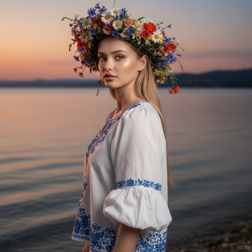 Девушка стоит в профиль у кромки воды, обратив лицо к зрителю. На ней белая хлопковая блуза с объемными рукавами, декорированная синей вышивкой на вороте и подоле. Голову украшает пышный венок из луговых цветов, блики пламени играют в ее глазах.