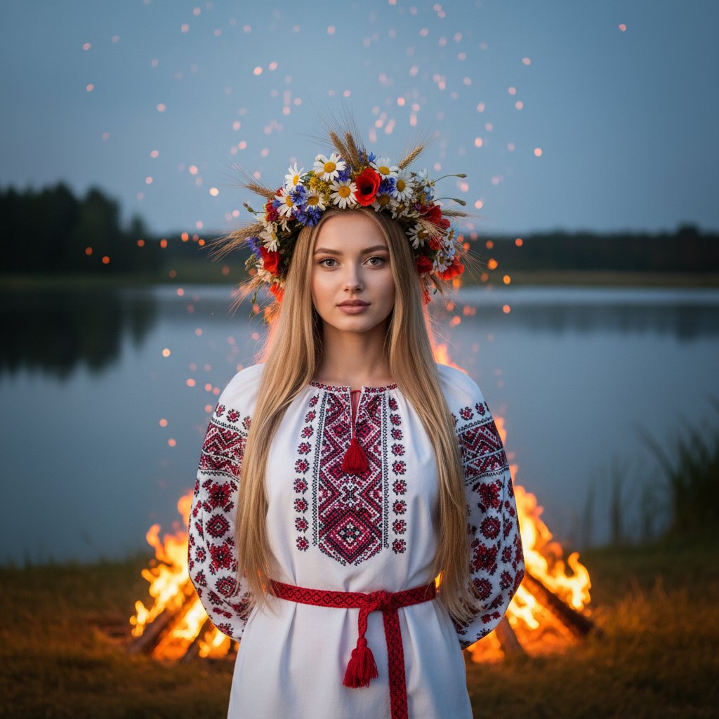 Молодая женщина в белой вышитой рубахе с поясом стоит у водоема. За ней пылает костер, а голову украшает венок из полевых цветов и колосьев. Взгляд направлен в объектив, руки заведены за спину.