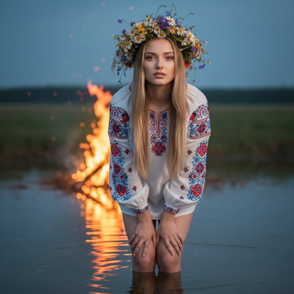 Молодая женщина в белой рубашке с сине-красной вышивкой у ворота и на рукавах, стоит по щиколотку в воде. На голове венок из полевых цветов. Она слегка наклонилась вперед, опираясь руками на колени, и смотрит прямо в объектив. За ней горит костер.