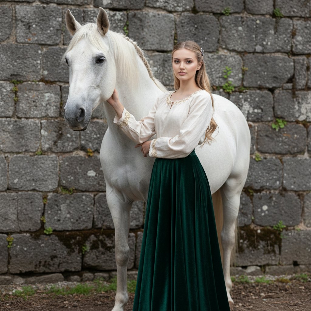 Молодая особа в старинном наряде, состоящем из длинной юбки и блузы с узорами, позирует возле белоснежного коня. На заднем плане — кладка из камня, характерная для средневековой крепости.