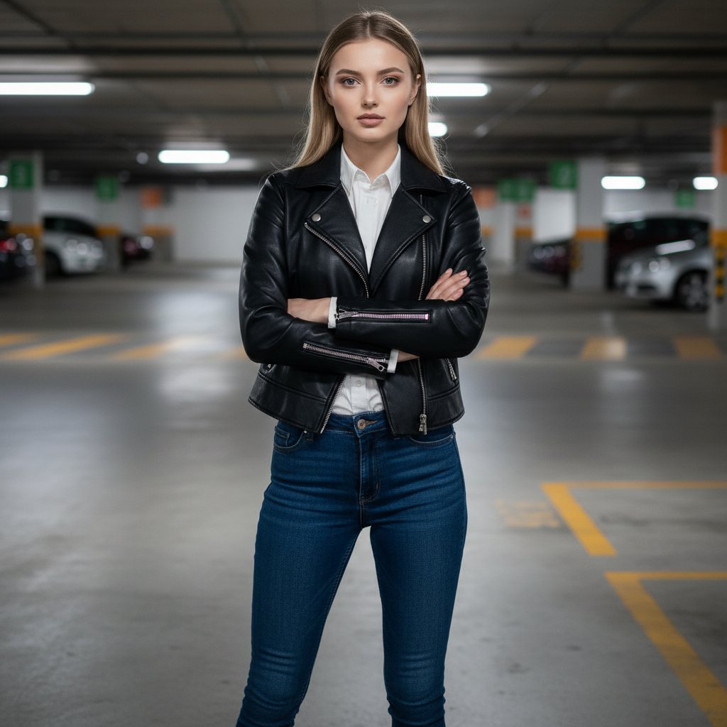 В полный рост, женщина в облегающей черной кожаной куртке, белой рубашке и темных джинсах. Она стоит, скрестив руки на груди, и смотрит прямо в объектив. Фотография сделана со среднего расстояния на фоне бетонной парковки с разметкой.