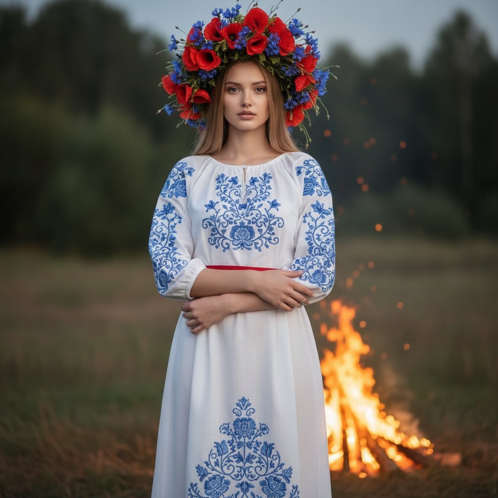 Юная особа в длинном белом платье из хлопка, с рукавами три четверти, украшенном нежной синей вышивкой и красным поясом, стоит у тёплого, мерцающего костра. Её голову обрамляет пышный венок из красных маков и синих васильков. Взгляд направлен прямо в объектив, обе руки спокойно сложены на груди.