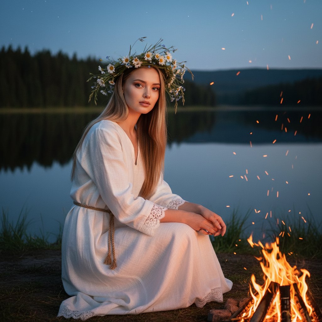 Молодая девушка у озера, рядом горит костер. На ней длинная белая рубаха с кружевными деталями и поясом. Голову украшает венок из полевых трав и ромашек. Она слегка наклонилась вперед, сложив руки на коленях, и смотрит в объектив.