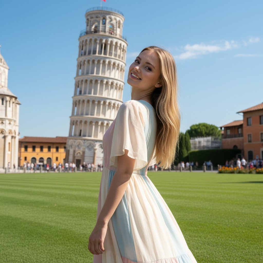 Изображение молодой женщины в легком летнем платье нежных оттенков, позирующей на фоне Пизанской башни. Яркий солнечный свет отбрасывает мягкие тени. Женщина изображена в профиль, с легким наклоном головы и улыбкой, обращенной к зрителю. За ней виднеется знаменитая наклонная башня с ее узнаваемой архитектурой, а перед ней — ухоженные зеленые лужайки и чистое голубое небо. Кадр передает ощущение беззаботности и счастья.