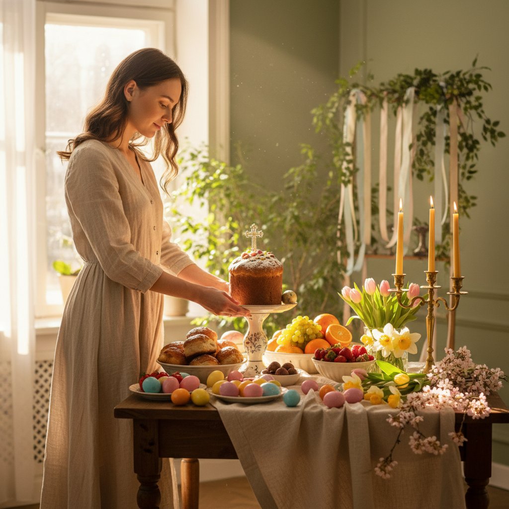 Создай солнечную пасхальную сцену с молодой женщиной в светлом платье. Она стоит у праздничного стола и ставит большой кулич на подставку. На столе лежат окрашенные яйца, булочки, фрукты и весенние цветы. Рядом стоят золотые свечи в подсвечнике. Интерьер светлый и уютный, стены в мягком зеленом оттенке, на фоне весенний декор. Солнечный теплый свет, весенняя атмосфера, домашний уют. Стиль — editorial lifestyle photography, warm natural light, photorealistic, highly detailed, 4k.