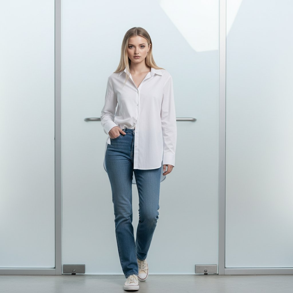 Женщина в джинсах прямого кроя и простой белой рубашке, частично заправленной спереди. На ногах светлые кеды. Она стоит у массивной стеклянной двери, немного наклонившись, опираясь на нее одной рукой. Взгляд сосредоточен на камере, снято крупным планом. Фон светлый и нейтральный.