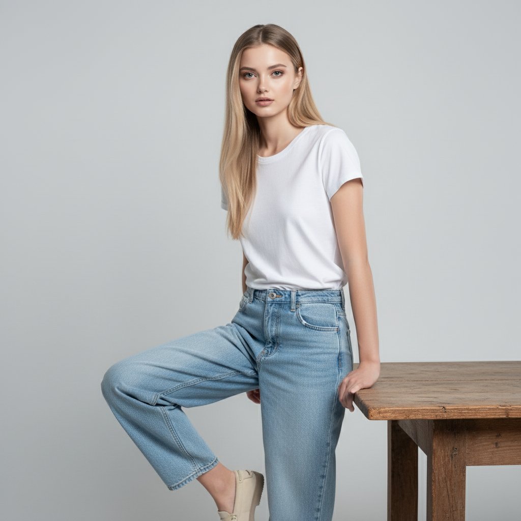 Молодая женщина в свободных джинсах голубого оттенка и простой белой футболке, на ногах светлые мокасины. Она опирается рукой на край деревянного стола, немного наклонившись вперед. Взгляд прямой и сосредоточенный, направлен в объектив. Крупный план, студийный фон без отвлекающих деталей.