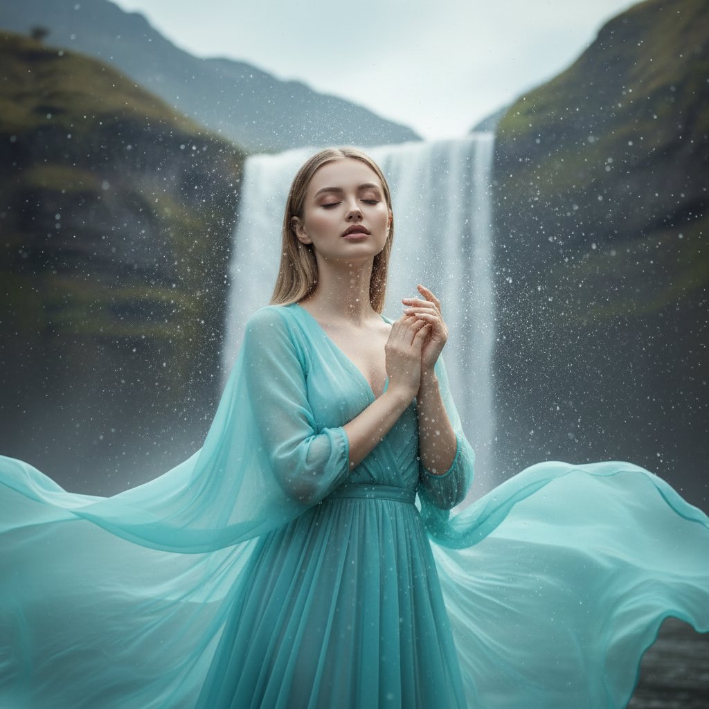 Женщина в воздушном бирюзовом платье у водопада, глаза закрыты, руки сложены. Водяные брызги создают лёгкую дымку. На заднем плане величественные горы. Крупный план, фокус на лице и воде.