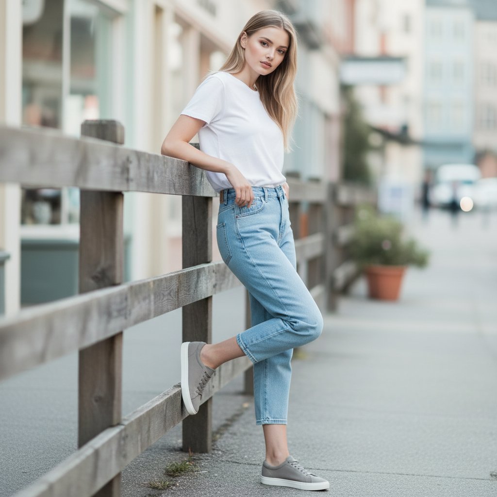 Молодая женщина в укороченных джинсах светло-голубого цвета свободного кроя и простой белой хлопковой футболке. На ногах серые кеды из замши в минималистичном стиле. Она расположилась у деревянного забора, поставив одну ногу на нижнюю перекладину и опираясь руками о верхнюю. Взгляд направлен в объектив. Задний план — улица в пастельных тонах.