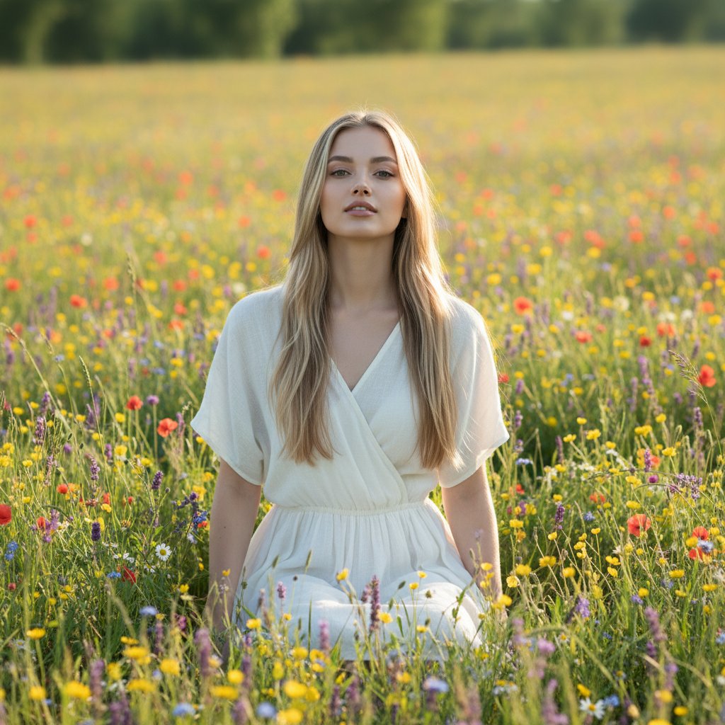 Молодая женщина в воздушном белом платье из льна расположилась на зеленом лугу, усыпанном полевыми цветами. Она слегка приподняла голову к солнцу, но взгляд ее направлен прямо в объектив, на лице — безмятежность. Атмосфера наполнена светом и чистотой, передавая легкое летнее настроение.