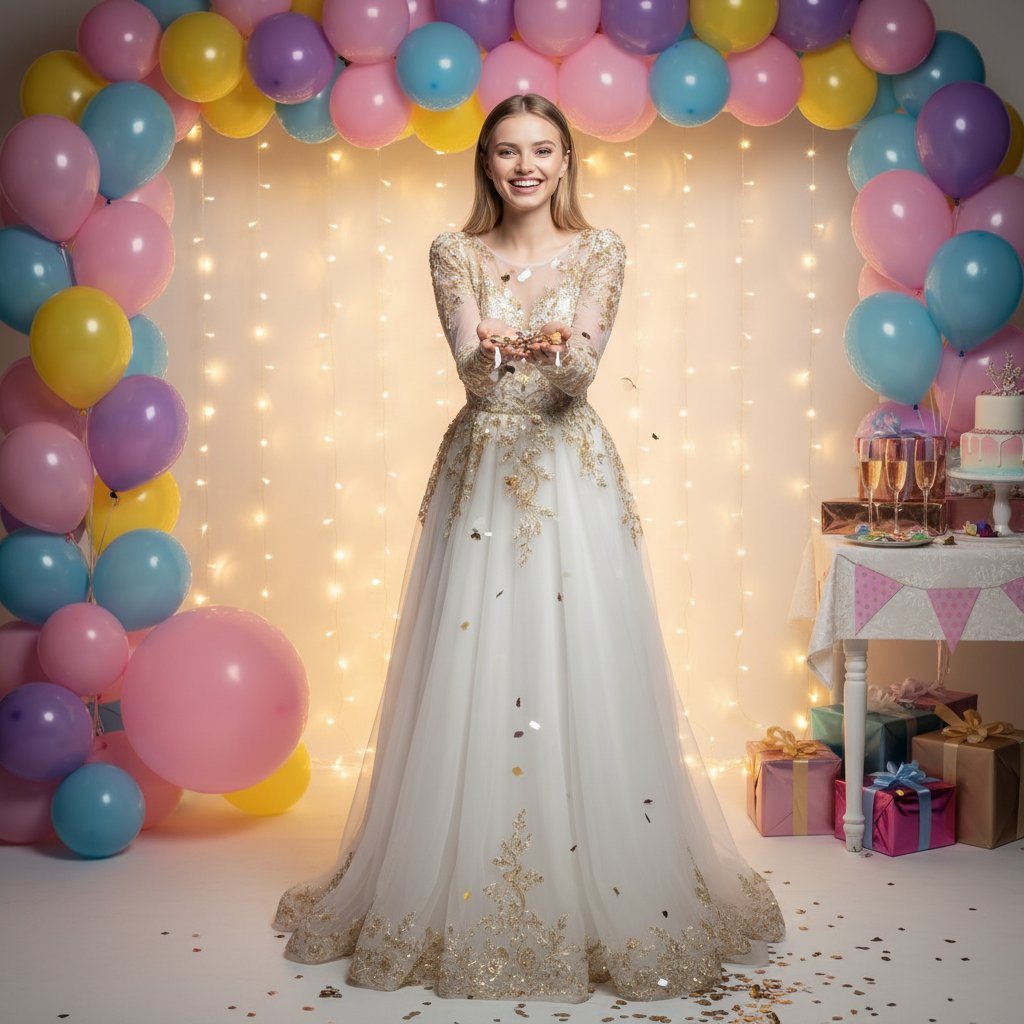 Фото девушки в элегантном белом платье с золотыми деталями. Она находится перед праздничной фотозоной, украшенной множеством разноцветных воздушных шаров и мерцающих светодиодных гирлянд. В руках у нее конфетти, а взгляд направлен прямо в камеру с выражением искренней радости. На заднем плане просматривается украшенный праздничный стол. Яркое освещение подчеркивает ее счастливое настроение.