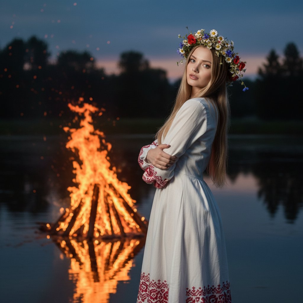 Девушка стоит спиной к живому костру, у кромки воды. На ней простое белое платье из хлопка, украшенное красной вышивкой по низу и на рукавах. Волосы украшены венком из полевых цветов. Она смотрит в камеру, слегка склонив голову, руки скрещены на груди.