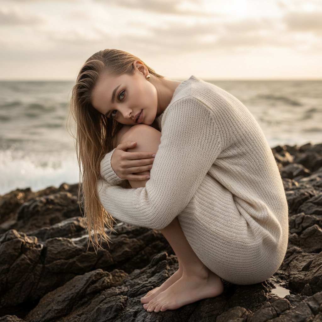 Фотография девушки сбоку, сидящей на корточках на мокрых скалах. Она склонила голову на колени, обхватив их руками. Влажные волосы, взгляд направлен в камеру. На фоне — море и мокрые скалы. Одета в белое вязаное платье, на ушах золотые серьги. Цветовая палитра: золотистый, бежевый, белый.