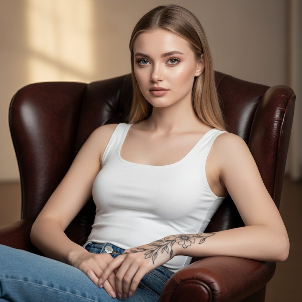 Молодая женщина в белом облегающем топе и джинсах расположилась в кожаном кресле. Руки спокойно лежат перед ней, демонстрируя изящную татуировку в виде цветочного узора, покрывающую предплечье и переходящую на кисть. Мягкое освещение создает теплую, располагающую атмосферу.