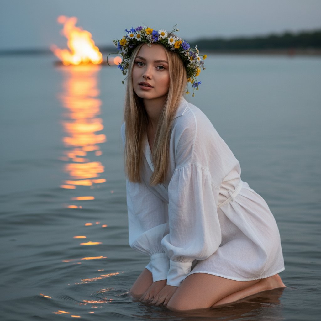 Юная особа в длинной белой рубашке со сборчатыми рукавами и пояском, стоит на коленях в прибрежной воде. На голове венок из полевых цветов. Она наклонилась, опираясь локтями на колени, и смотрит в объектив. На заднем плане — блики от костра, отражающиеся в воде.