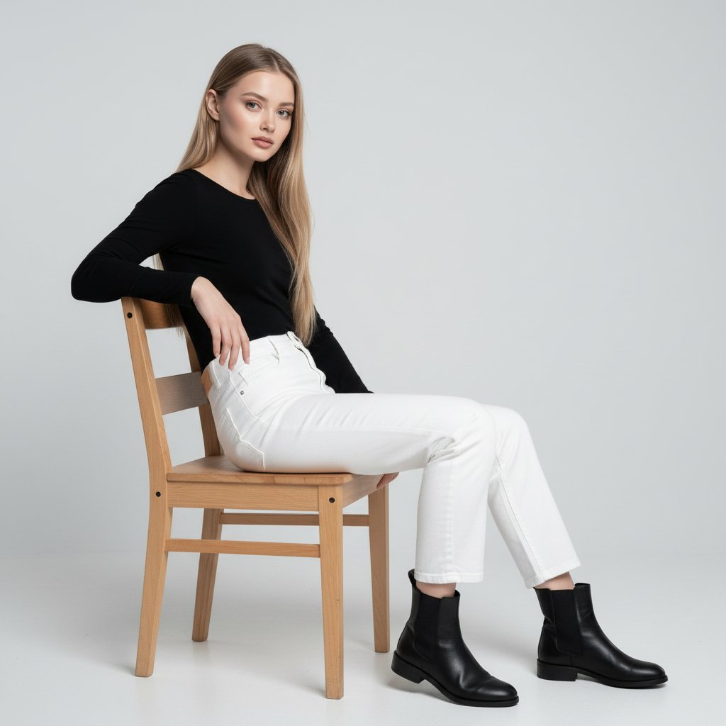 Молодая женщина в прямых белых джинсах и черном облегающем лонгсливе. На ногах — лаконичные кожаные ботинки на плоской подошве. Она сидит на деревянном стуле, повернувшись боком к зрителю. Одна рука опирается на спинку стула, взгляд прямой и уверенный. Фон — светлый, минималистичный студийный.