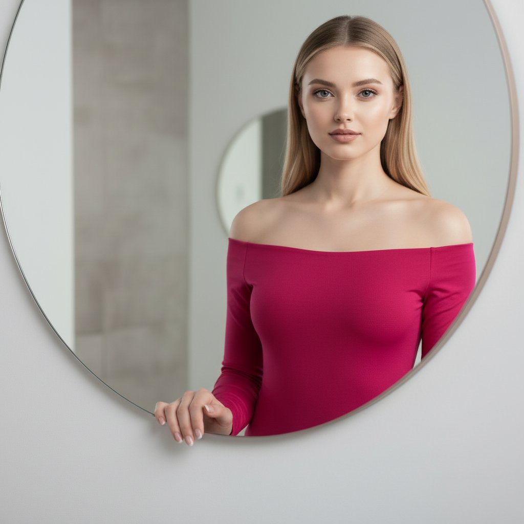 Женщина в ярко-малиновом боди с открытыми плечами расположилась у круглого зеркала, закрепленного на стене. Она смотрит прямо в объектив, а одна рука нежно касается края зеркальной рамы. Мягкое освещение подчеркивает гладкость кожи и создает выразительный образ. Снято со среднего плана.