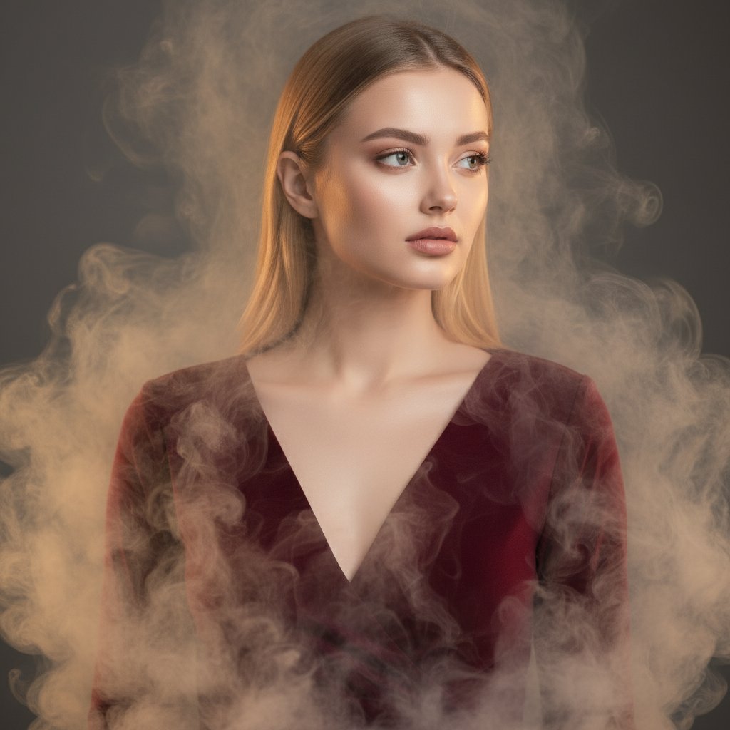 Портрет женщины в бордовом платье с декольте, окутанной клубами густого дыма. Лицо крупным планом, взгляд отведен в сторону. Теплое освещение подчеркивает глубокий цвет платья и плотность дымки, окутывающей ее силуэт.