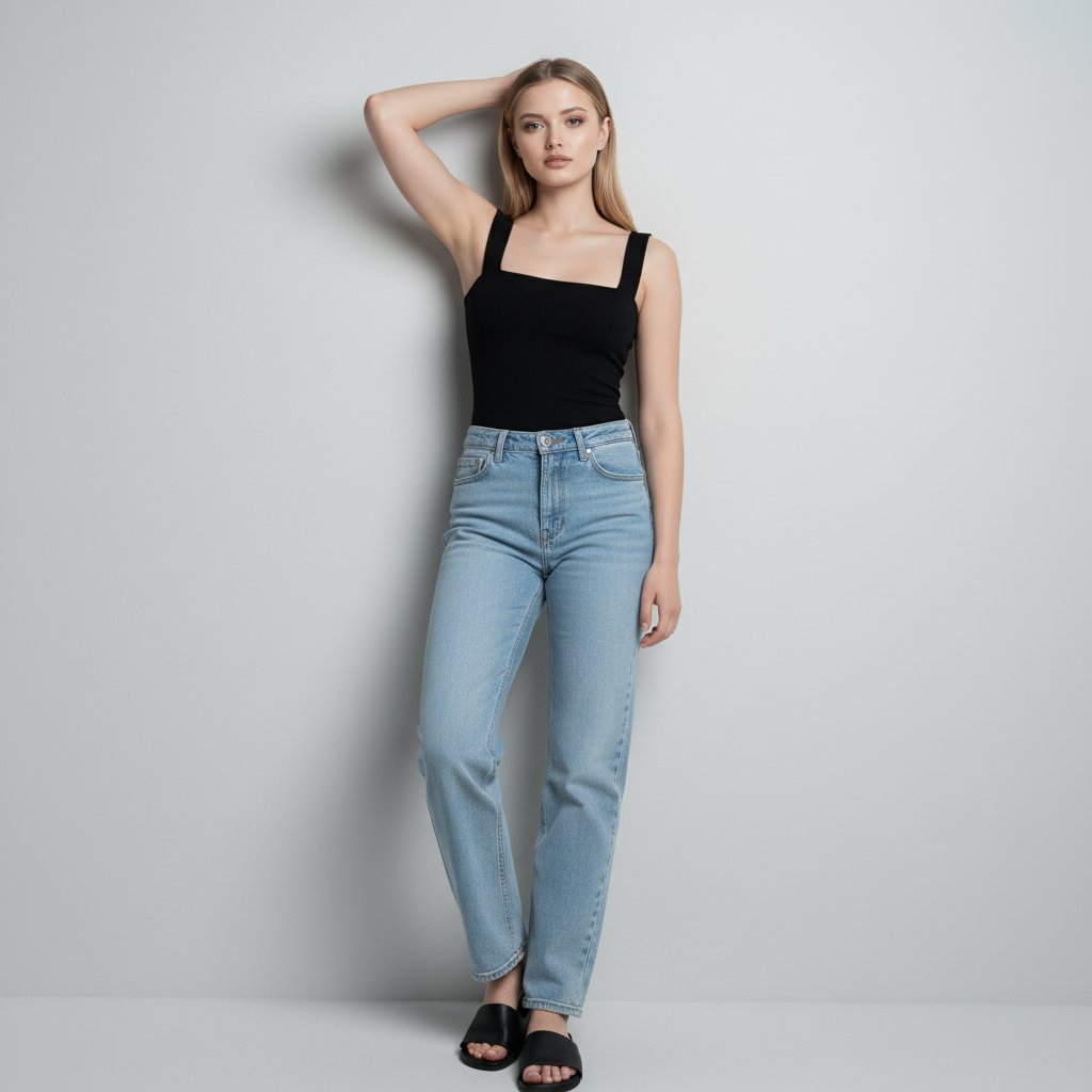 Молодая женщина в джинсах голубого цвета и черном топе на широких бретелях. На ногах — простые шлепанцы. Она стоит, прислонившись к стене, одна рука за головой, другая расслабленно опущена. Взгляд уверенный, направлен в объектив. Минималистичный студийный фон.